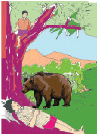 வினோத் : ஐயோ, கரடி வருகுது. இப்போது என்ன செய்யலாம்? நாம் இருவரும் ஒரு மரத்துக்கு மேல் ஏறுவோம். கரடிக்கு மரம் ஏறத் தெரியாது. வினோத் சொன்னதைக் கேட்ட சுதன் பயந்தான்.